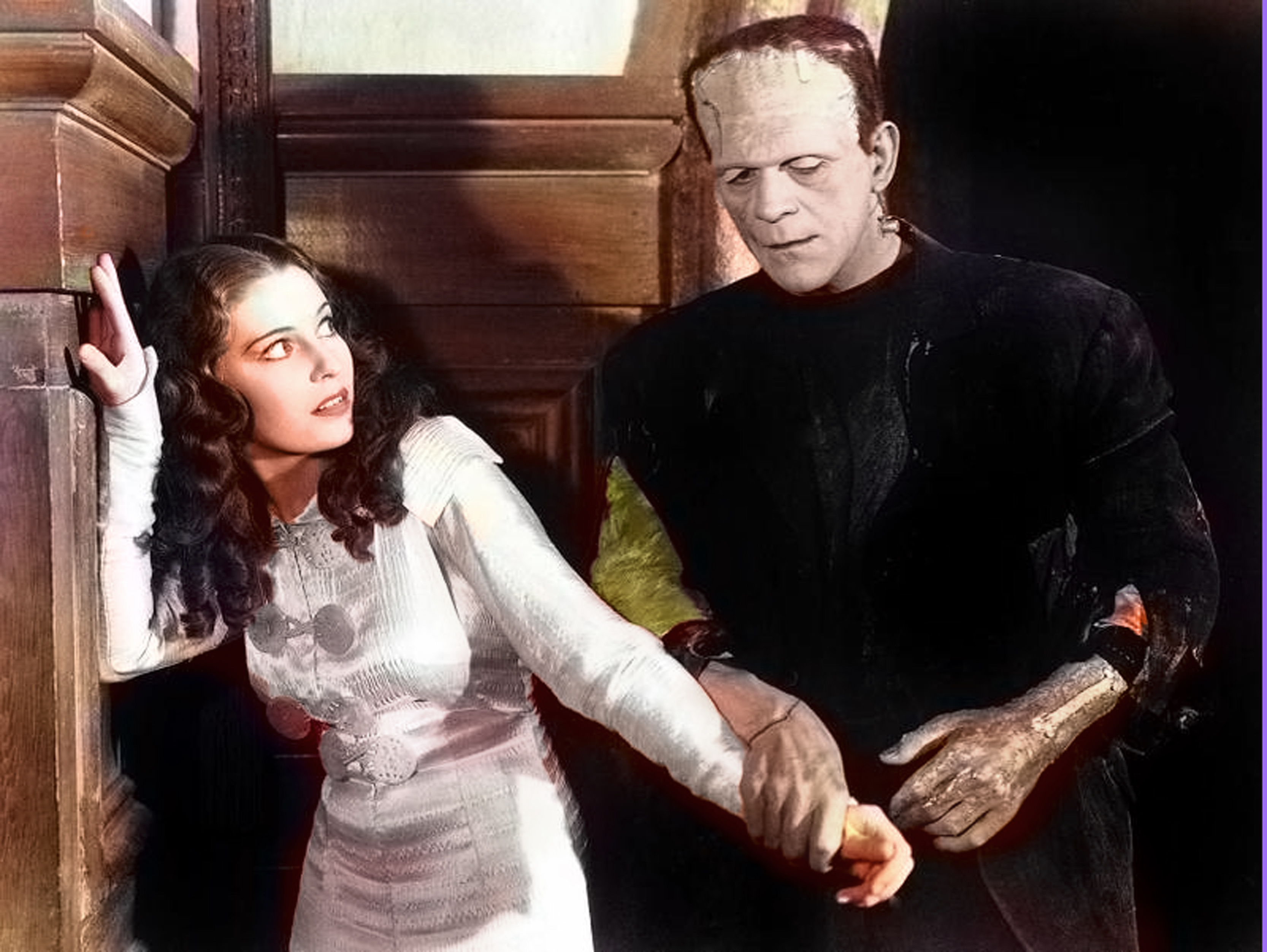 These are a series of posed shots that are not scenes from the film itself. Lovely Valerie Hobson plays Elizabeth, Baroness Frankenstein, and Ernest Thesiger is the unforgettable Doctor Pretorius. I added color: