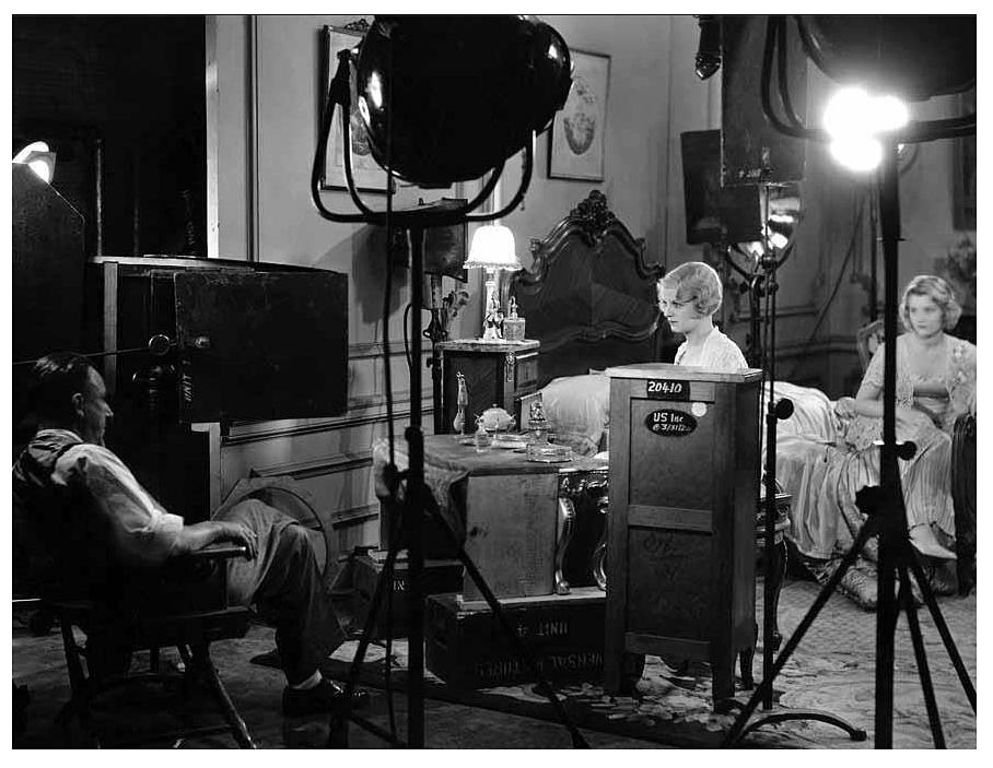 A fascinating behind the scenes photo showing the chaos of equipment and wires, none of which are seen in the filmed shot. Tod Browning, Frances Dade, and Helen Chandler: