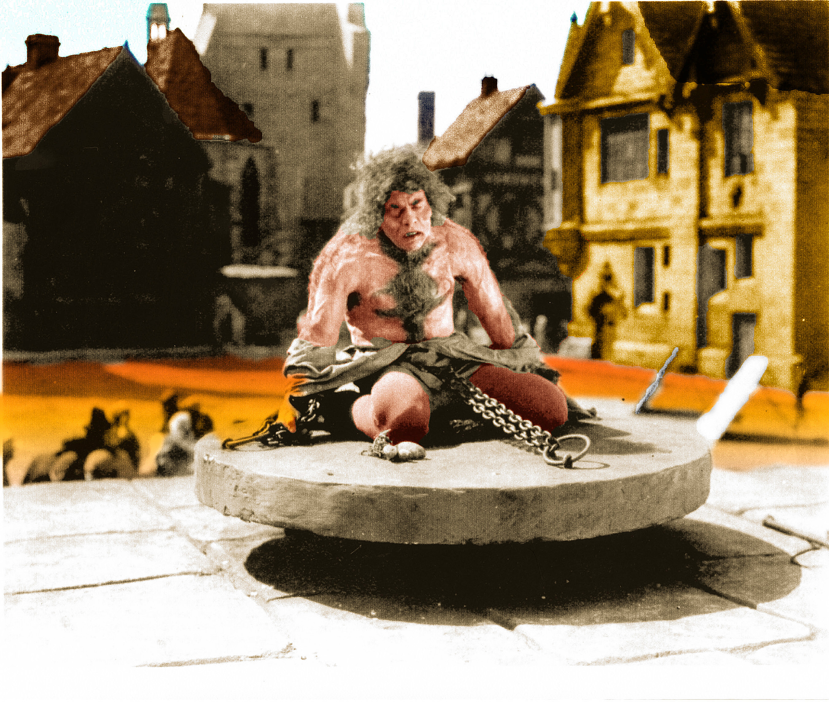Chaney waits between camera setups in perhaps the most famous scene in THE HUNCHBACK OF NOTRE DAME (1923). Note the two reflectors on the right used to redirect the sunlight to brighten up shadows on the buildings across the plaza: