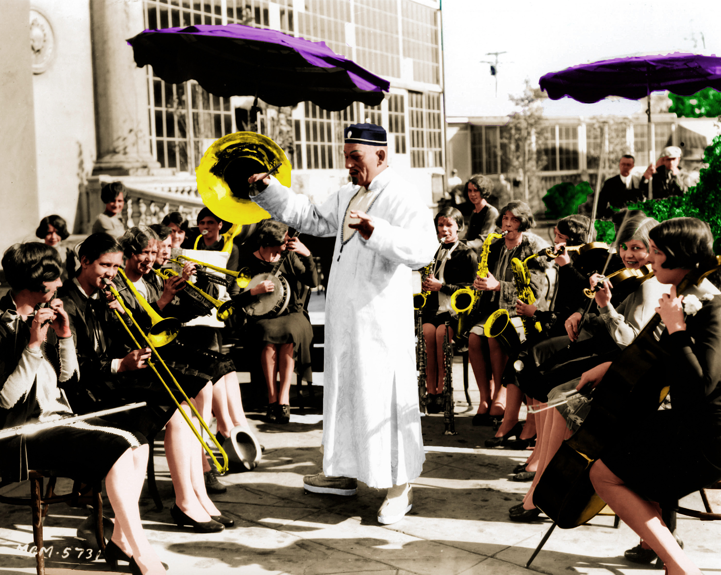 Lon plays three generations of an Asian family in Mr. Wu (1927). Here he takes a break from filming by conducting a student orchestra visiting the MGM studio: