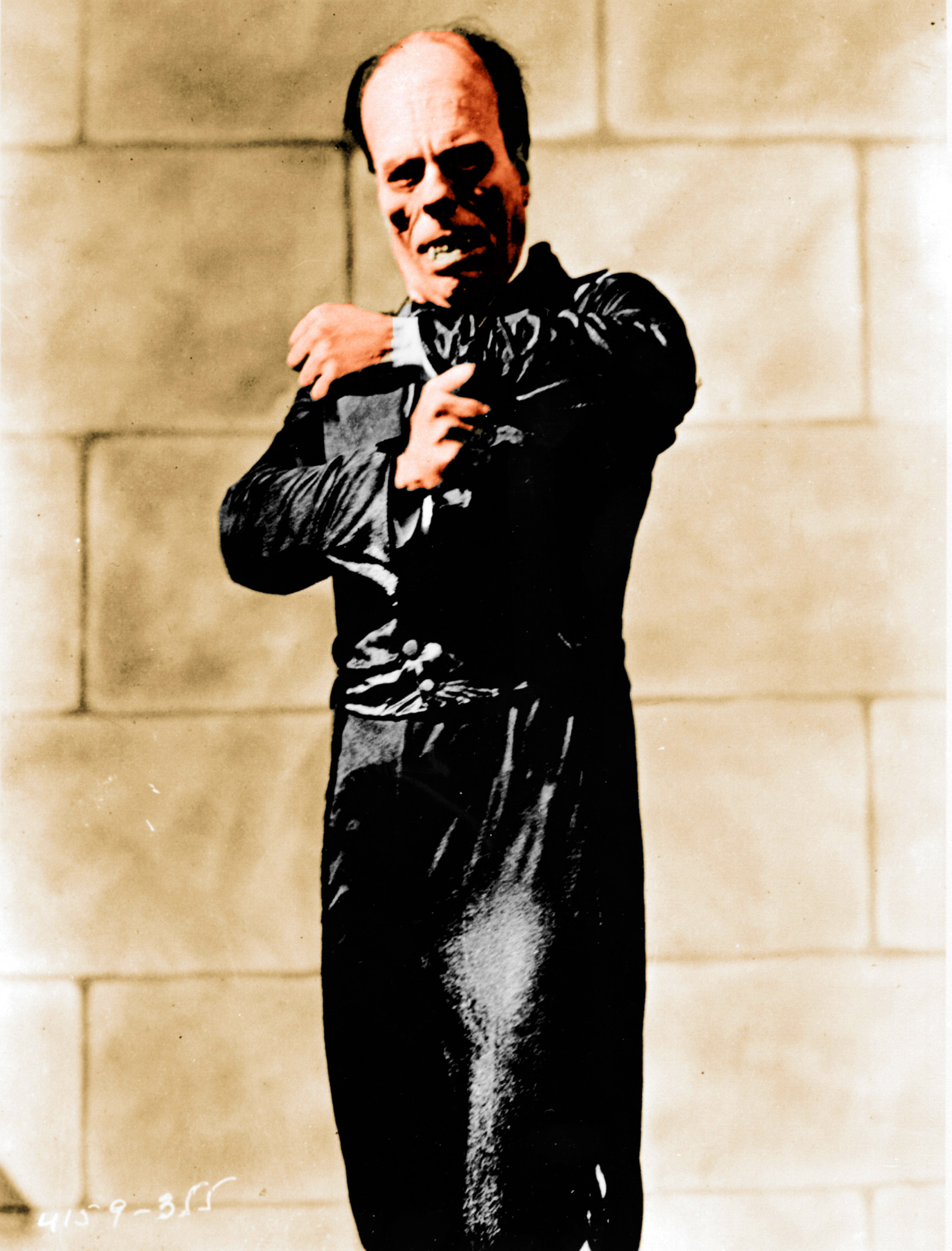 Lon wrings out his sleeve after emerging from the underground lagoon beneath the Paris Opera House in THE PHANTOM OF THE OPERA (1925). Chaney’s makeup design for Erik the Phantom was arduous enough but now it also had to be waterproof: