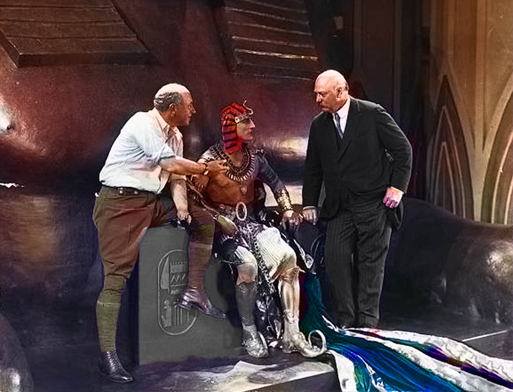 On the set of THE TEN COMMANDMENTS (1923) director/producer Cecil B. De Mille (on the left) introduces the U.S. Secretary of War John Weeks to the Pharoah Rameses aka Charles De Roche: