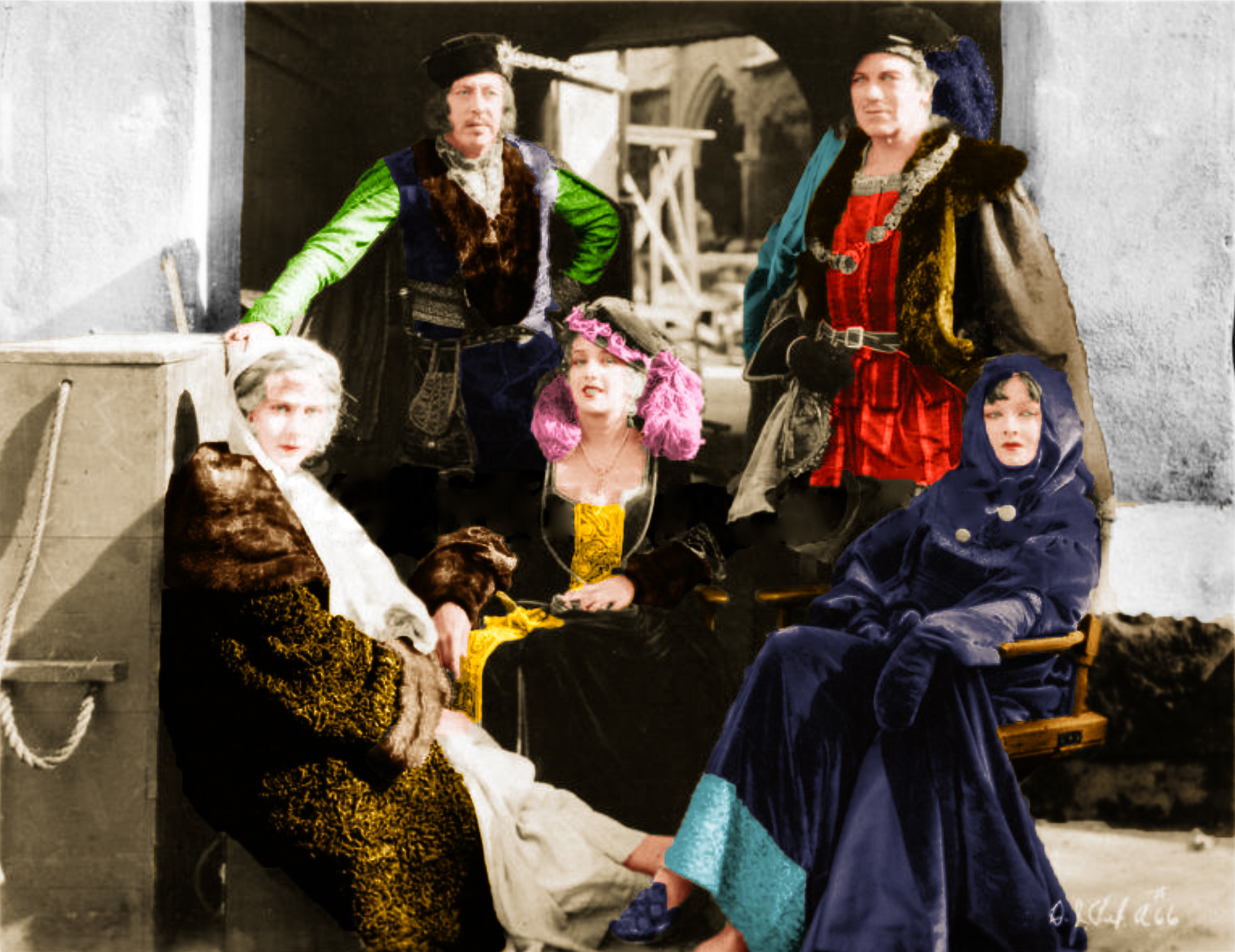 DON JUAN (1926), the first feature film to use synchronized sound, had Warner in the historical role of Cesare Borgia. Here is Warner on the DON JUAN set with Montagu Love on the right, and seated left to right, Helene Costello, Estelle Taylor, and Myrna Loy: