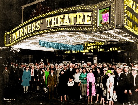 The Dawn of Sound Films arrived, oddly enough, with a silent film on the evening of August 6, 1926, in New York City at the Warner Theater. Musical accompaniment was provided by the 107 members of the New York Philharmonic Orchestra – via recording heard over the theater’s public address system. But a series of short films preceded the main feature in which various performers from the opera, theater, and vaudville spoke, sang, and played instruments. The main feature was DON JUAN, starring a real-life Don Juan – John Barrymore, who had just taken two continents by storm with his modernized version of HAMLET on the stage. The Great Profile, as Barrymore was nicknamed, spoke not an audible word but the audience was captivated by the unerring synchronization of music and action (plus a few sound effects like church bells) through a system called Vitaphone. Nobody suspected it on that night, but the tolling of those church bells turned out to be a funeral dirge for silent film (a beautiful artform, by the way):