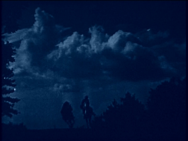 This well-known story of Americana was filmed on location in the Hudson River Valley, New York, near where Irving had lived and wrote in Tarrytown. THE HEADLESS HORSEMAN is historically important as the first feature film to use the new panchromatic film stock. Unlike the old orthochromatic film stock that did not photograph certain colors such as blue, and missed clouds entirely (with clear skies looking gray), panchromatic film brought out all the details as these frame grabs indicate: