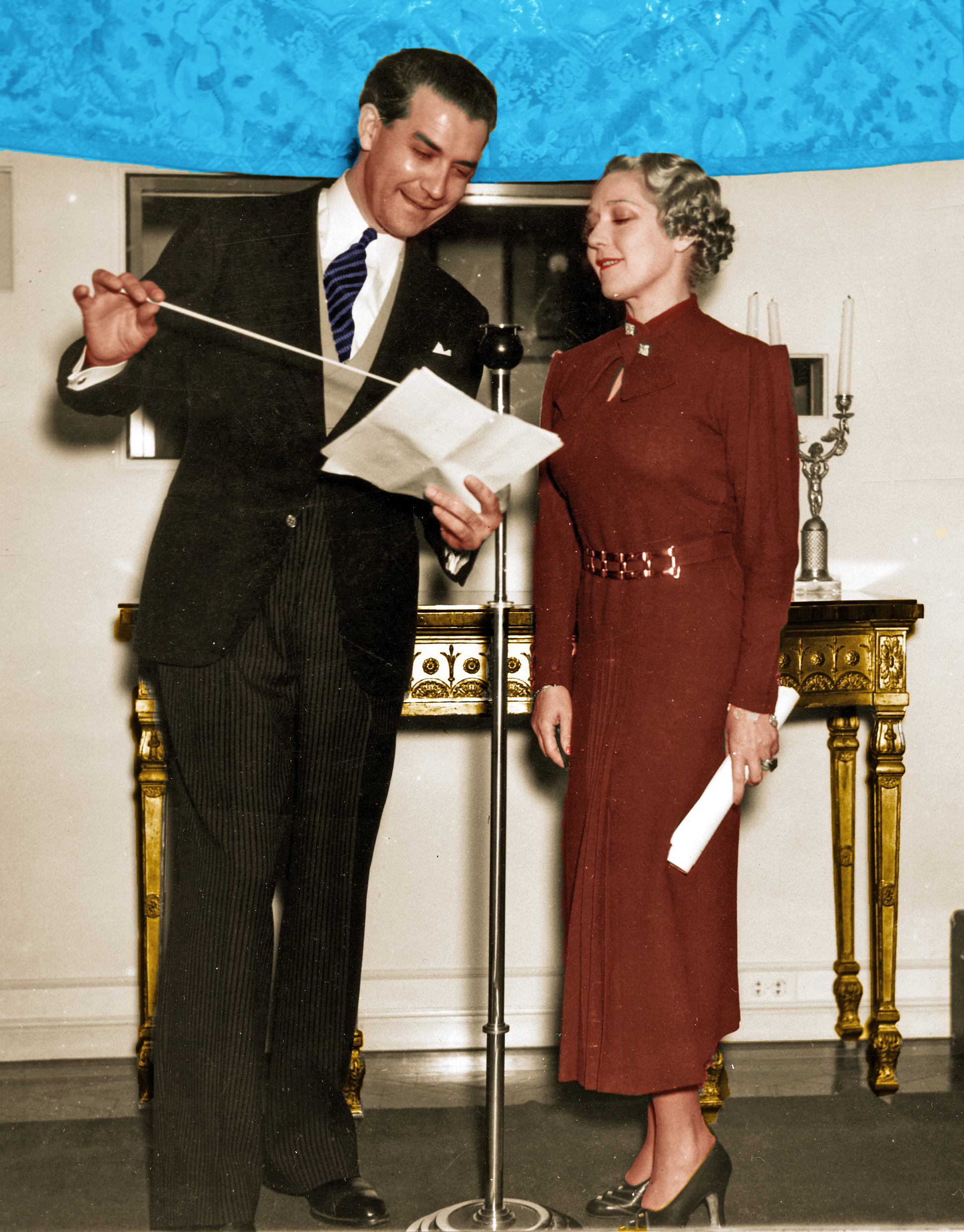 Mary pursued numerous projects during the 1930s including radio broadcasting. Here she runs through the script with bandleader Al Lyon, director of the Coconut Grove Orchestra, for the debut of Mary’s show, Parties At Pickfair, on February 9, 1936: