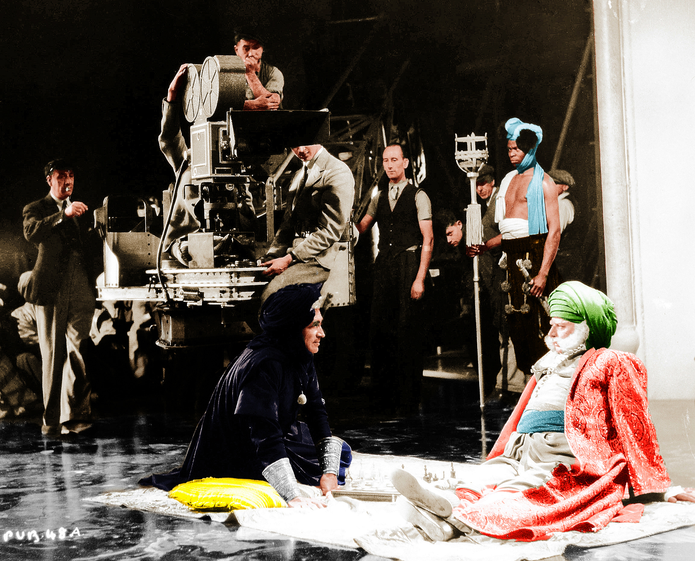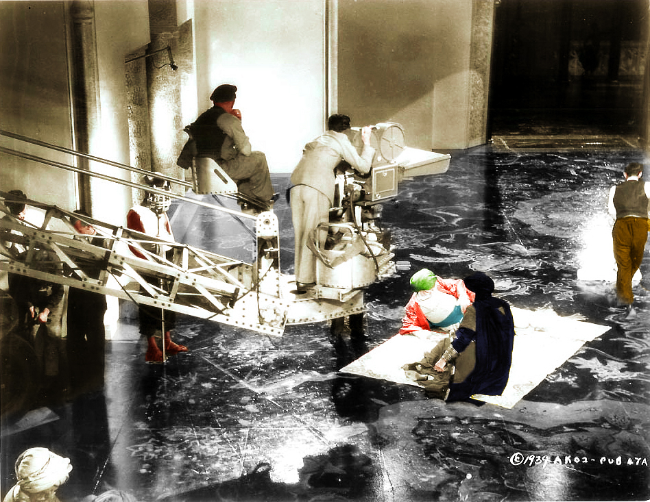 This production photo from THE THIEF OF BAGDAD shows Conny on the left on the floor. The massive Technicolor camera holds three rolls of film that were photographed simultaneously through one lens. A prism split the image into three that was photographed on each of the three rolls sensitive to red, blue and yellow respectively: