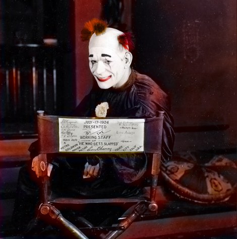 Lon Chaney poses in a gift chair given to him by the crew of HE WHO GETS SLAPPED (1924), which was the first film produced by the then-newly formed MGM. Alas,inquiries indicate that this chair no longer exists: