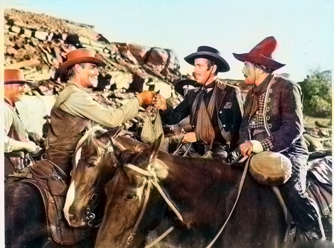 In one of his more unusual roles, Humphrey Bogart plays a Mexican bandit in VIRGINIA CITY (1940). On the left is Randolph Scott, on the right is George Regas: